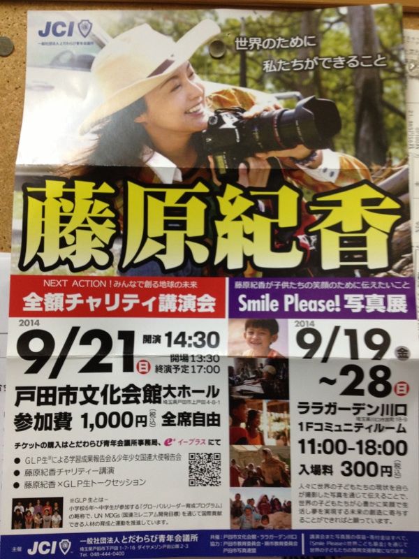 9月21日に戸田市文化会館で、青年会議所主催で藤原紀香さんのチャリティ講演があるそうです。